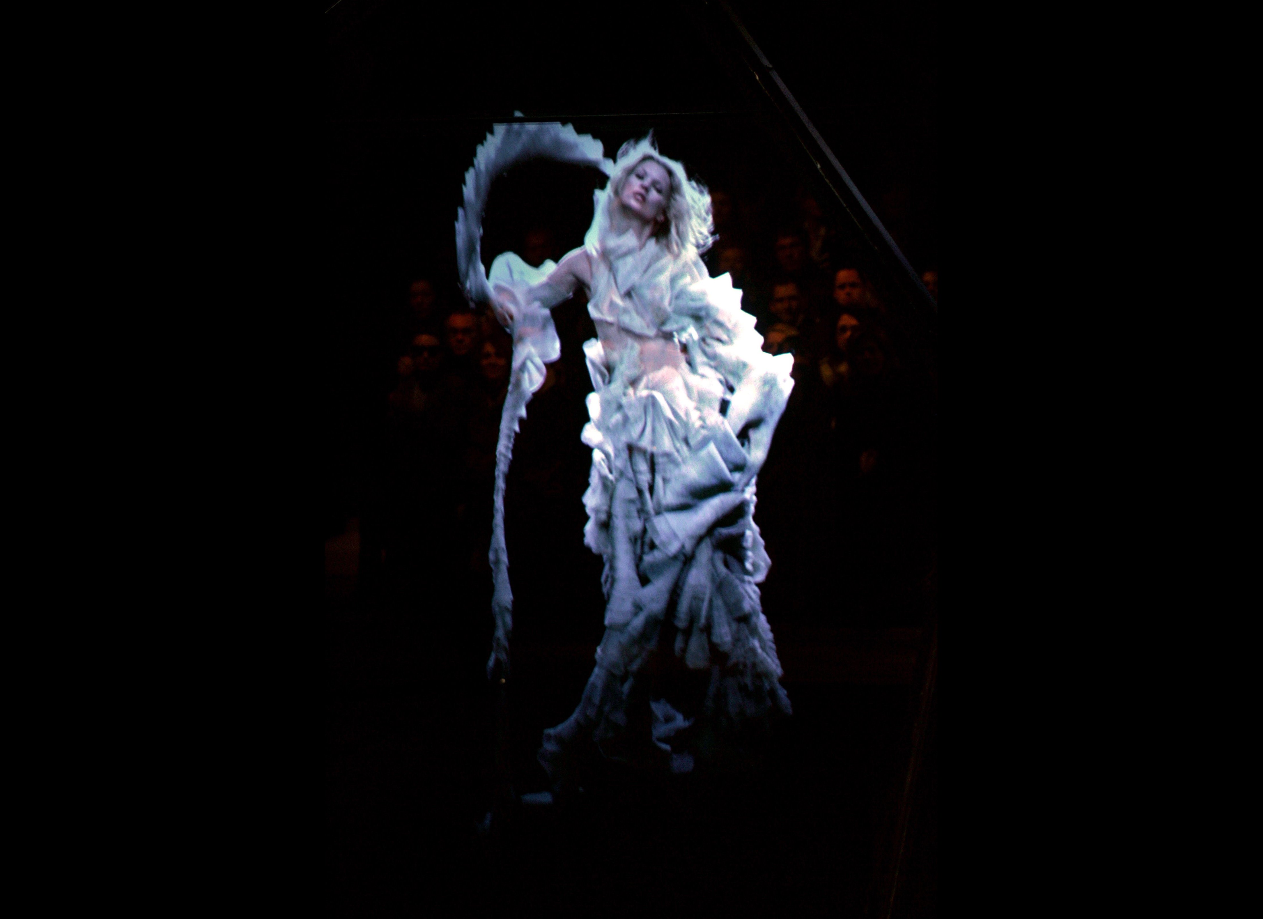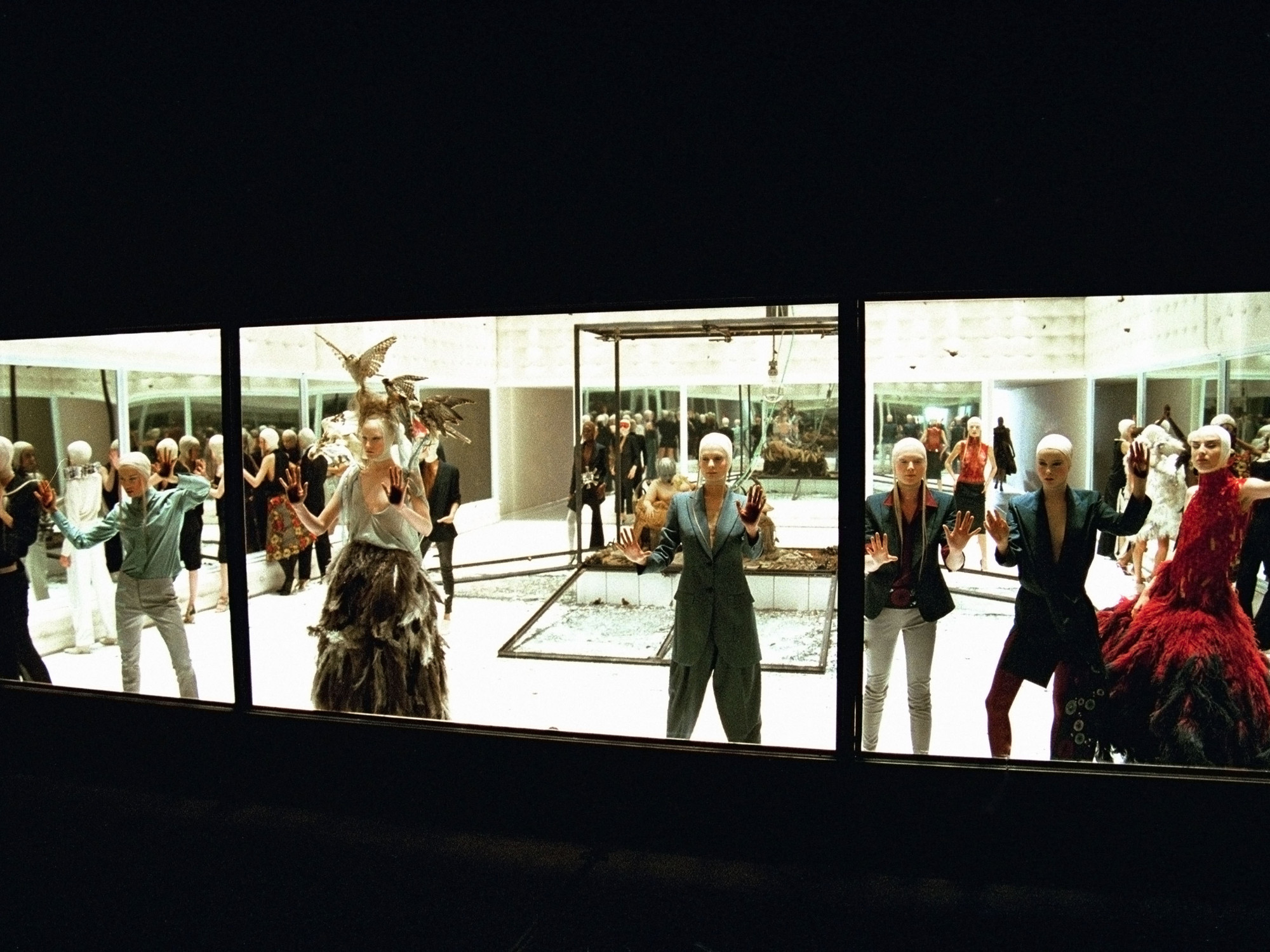 McQueen's most celebrated and dramatic catwalk show was his 2001 Spring/Summer collection, named VOSS. The centre piece tableau that dominated the room was an enormous glass box. But because the room outside the box was lit and the inside of the box was unlit, the glass walls appeared as large mirrors, so that the seated audience saw only their own reflection. Finally, after an hour, and when the show began, lights came on inside the enormous glass case and revealed the interior to be filled with moths and, at the centre, a naked model on a chaise longue with her face obscured by a gas mask. The glass walls then fell away and smashed on the ground.
